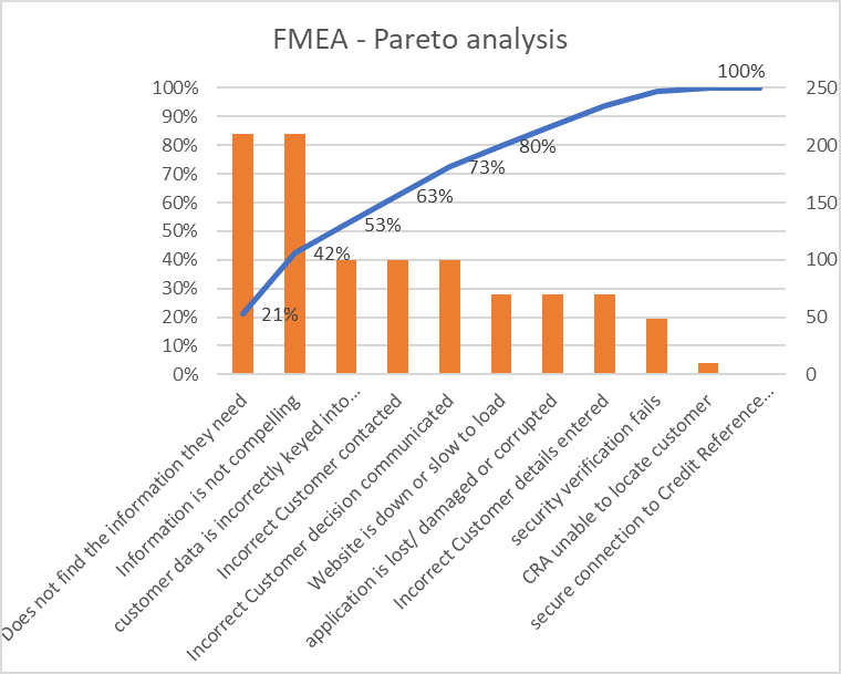 Rank the issues by priority score — calculate the priority (known as the RPN Risk Priority Number), by multiplying Severity x Occurrence x Detection. This will identify the biggest potential issues, you can now use Pareto analysis to focus effort on the areas of biggest impact
