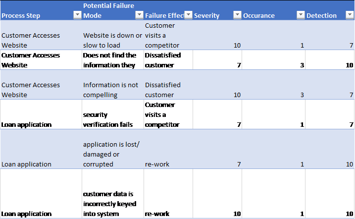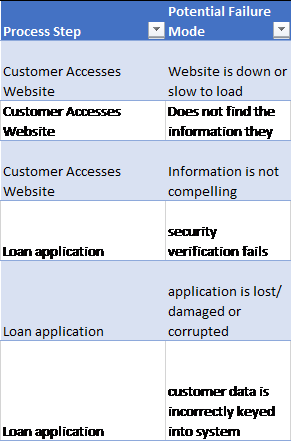 Map out the process — the team should walk through the process end to end at a good level of detail (no less than 5 steps, ideally at least 10). It is important to ensure that everyone agrees the output of this step. If people don’t this might be because the scope is different (existing vs. new customers) or because the process is not consistently followed. If a scope problem — re-frame the scope, if it’s a consistency problem then an FMEA will have limited value until the variability is addressed