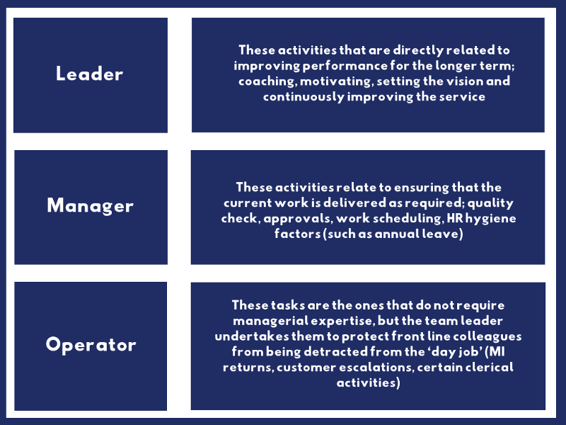Operator — These tasks are the ones that do not require managerial expertise, but the team leader undertakes them to protect front line colleagues from being taken away from the ‘day job’ (MI returns, customer escalations, certain clerical activities etc.)