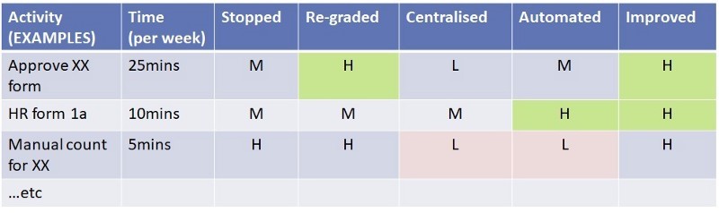 Using the outputs of step one you can now review each activity for improvement opportunities — it makes sense to focus on the most time consuming “Operator” and “Manager” tasks first.
